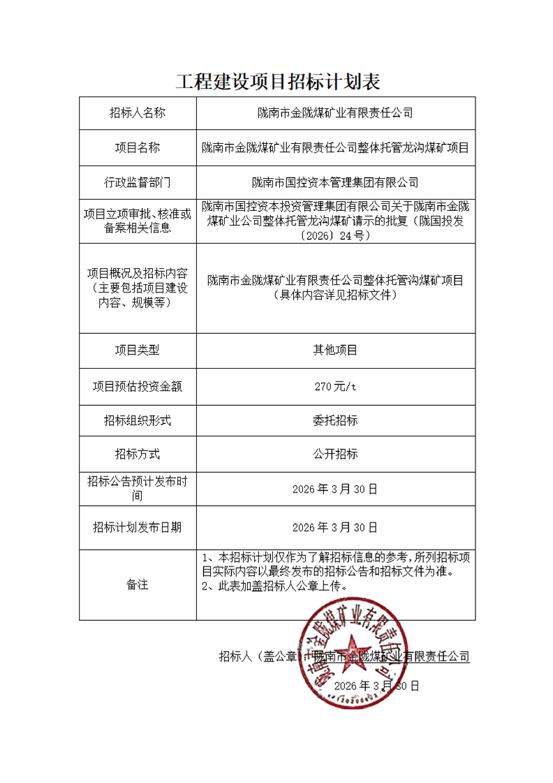 隴南市金隴煤礦業(yè)有限責任公司整體托管龍溝煤礦項目