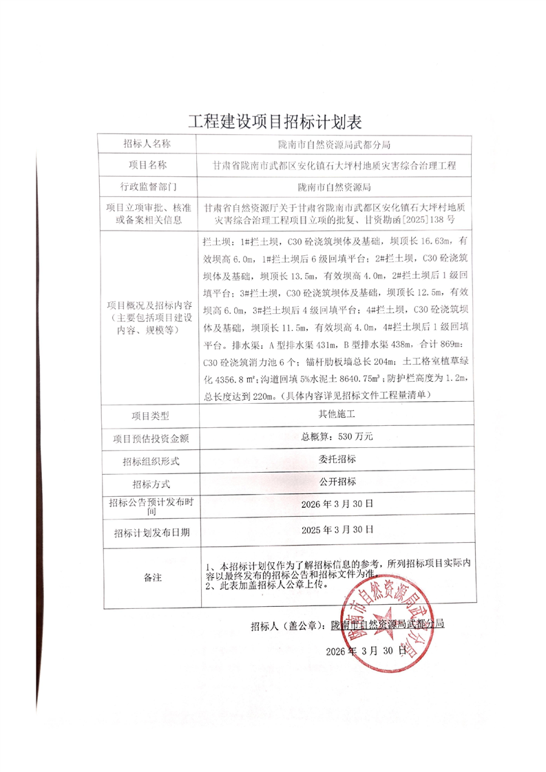 甘肅省隴南市武都區(qū)安化鎮(zhèn)石大坪村地質(zhì)災(zāi)害綜合治理工程項目