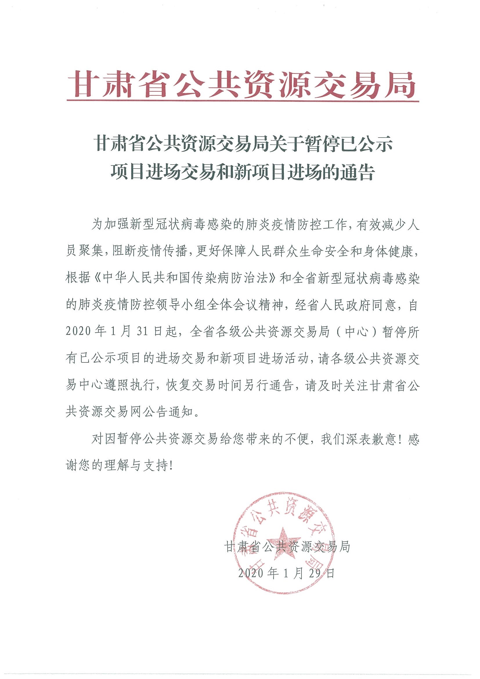 甘肅省公共資源交易局關于暫停已公示項目進場交易和新項目進場的通告